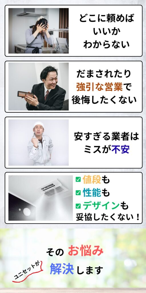 ユニセットは数少ない「メーカー工事」ができるお店。器具施工のリフォームで2000件以上の実績があります。豊富なノウハウでお客様の「不安」を「安心」にリフォームいたします。